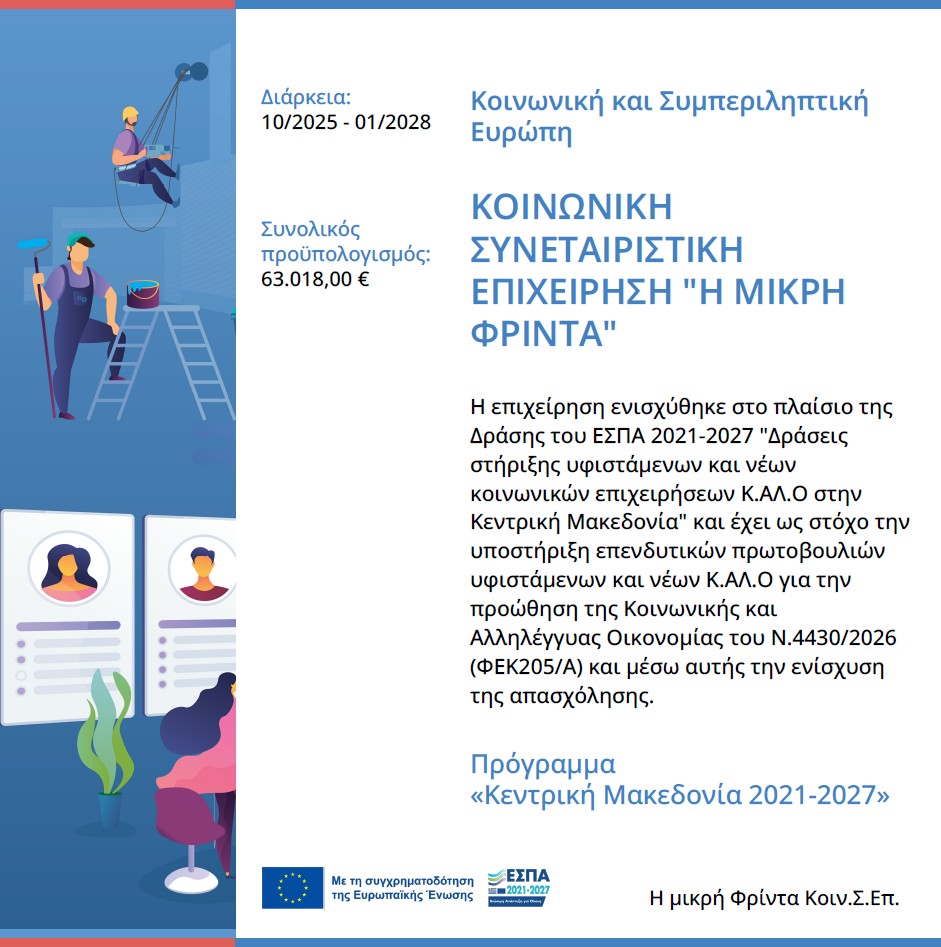 Η μικρή Φρίντα Κοιν.Σ.Επ. ενισχύθηκε στο πλαίσιο της «Δράσεις στήριξης υφιστάμενων και νέων κοινωνικών επιχειρήσεων Κ.ΑΛ.Ο. (επιχορήγηση για δημιουργία θέσεων εργασίας, για ίδρυση νέων επιχειρήσεων, δικτύωση, ενημέρωση, ευαισθητοποίηση, υποστήριξη λειτουργίας θερμοκοιτίδων, κλπ.) στην Κεντρική Μακεδονία» 2021 – 2027.